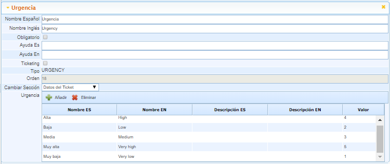 Permite añadir un campo de tipo Select, con opciones configurables para valorar la urgencia.