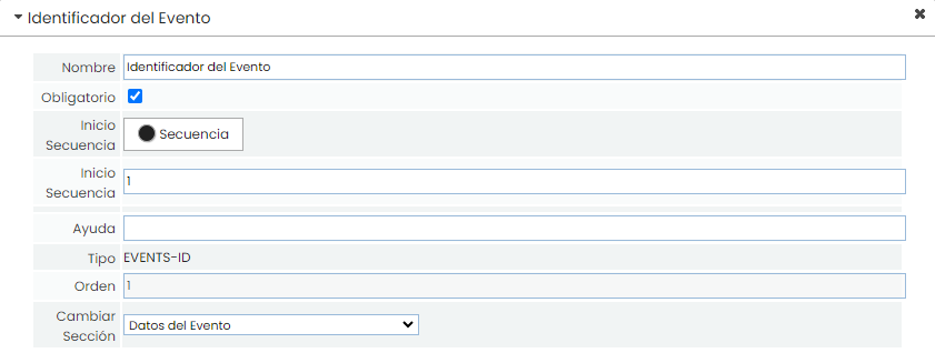 Muestra el identificador del Evento. Este campo siempre es secuencial (un número correlativo). Es posible indicar en qué número comenzará la secuencia, en caso de que se haya estado gestionando previamente de forma externa a GlobalSuite®.