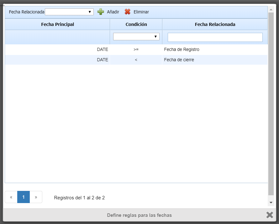 Configuración de Reglas de Fechas: Este botón permite definir restricciones que deben cumplir el campo de fecha respecto a otras, pudiendo obligar a que sea anterior posterior o igual a una dada. Cuando se abre la ventana, es posible seleccionar qué fechas y qué tipo de restricción existe respecto a la fecha que se está configurando.