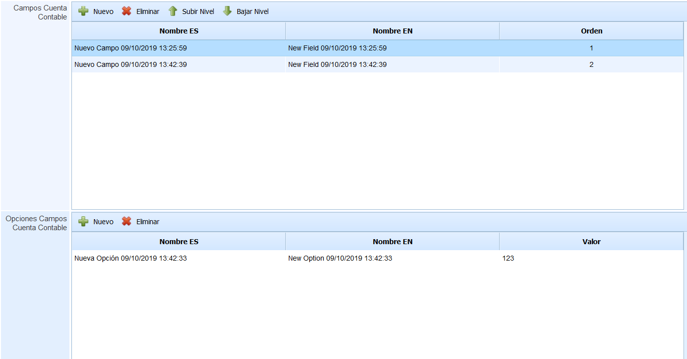 Campos Cuenta Contable: Esta tabla nos permite definir qué campos se van a utilizar para definir la cuenta contable de las cuantificaciones y los recuperos (la configuración es común a ambas). Al seleccionar un campo, en la tabla inferior se podrán definir las opciones que se pueden elegir para ese campo, incluyendo el valor numérico correspondiente.