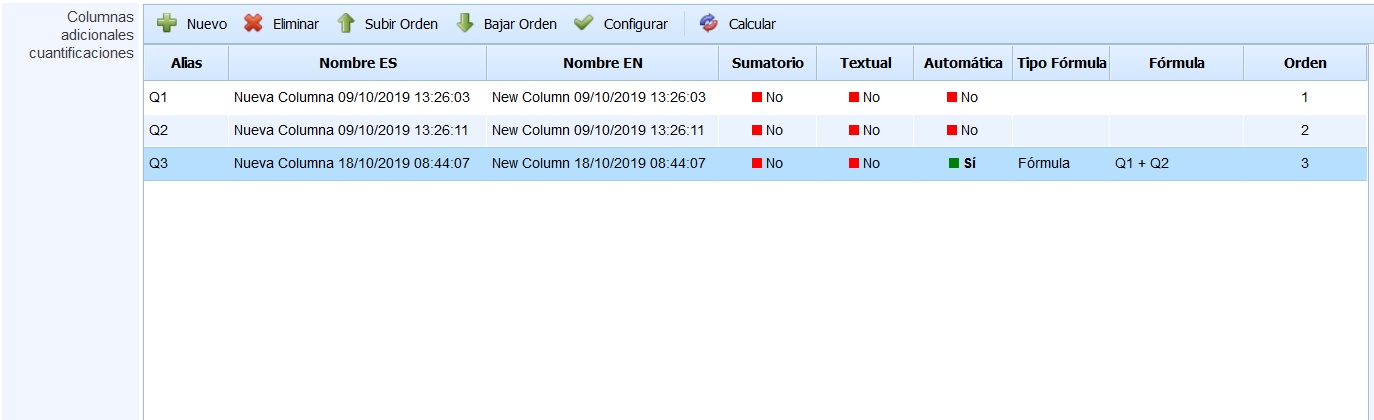 Orden: Indica en qué orden se mostrará el campo en la tabla de cuantificaciones o recuperos. Es posible ajustarlo mediante los botones Subir y Bajar.