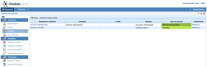 El funcionamiento de esta opción ya ha sido explicado en el apartado 'Ajustes/Usuarios' (para acceder directamente pinche el siguiente enlace: Usuarios). A continuación se explican los tipos de usuarios para las empresas consulting, gold y platinum.