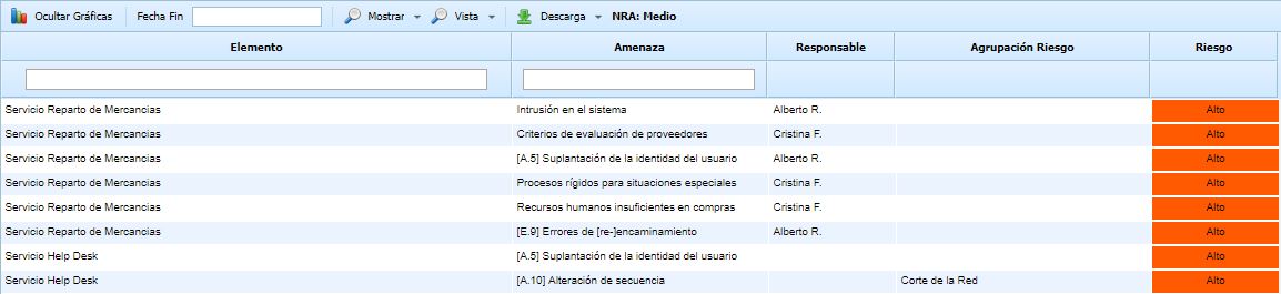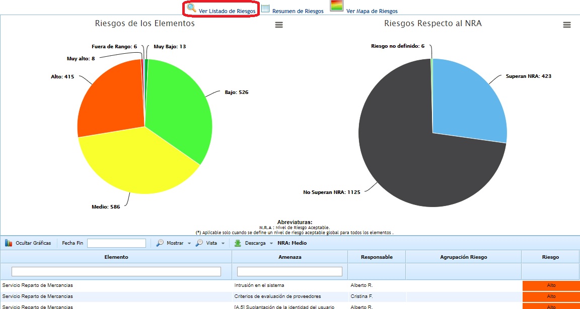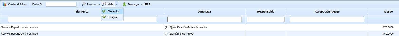 Mostrar: Permite filtrar el listado de elementos mostrando aquellos que únicamente superan el NRA (Superan el NRA), mostrando el listado con todos los elementos y riesgos valorados (Todos) o filtar por el porcentaje identificado en el apartado de 'Ajustes /Metodologías Análisis'.