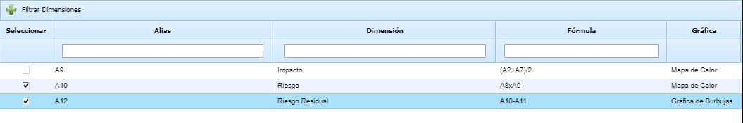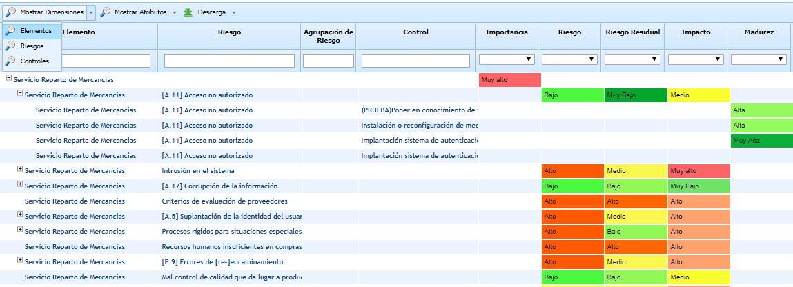 Mostrar Dimensiones: Permite seleccionar que dimensiones (cuantitativas o cualitativas) de los Elementos, Riesgos, o Controles van a aparecer en el listado. Por defecto aparecen visibles las dimensiones configuradas en el apartado de Ajustes.