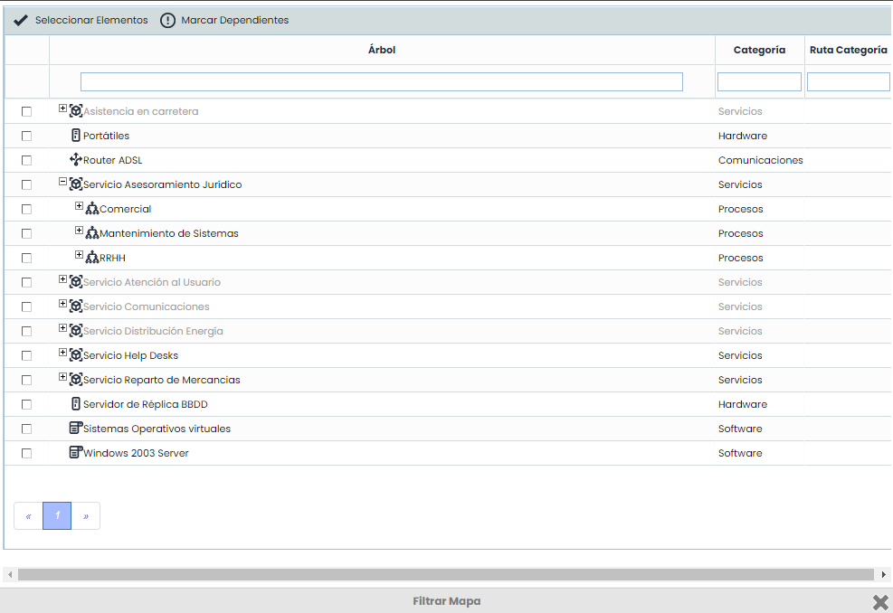 Filtrar Mapa: Permite seleccionar los elementos que formarán parte del Mapa de Riesgos. Esto permite obtener un Mapa de Riesgos con únicamente los riesgos asociados a los elementos seleccionados.