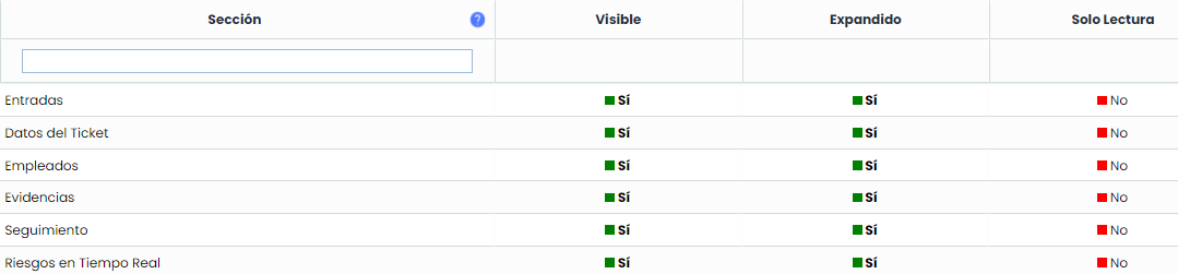 En la parte superior derecha se encuentra una tabla que contiene las secciones del formulario del ticket. Esta tabla se encuentra asociada a la tabla de estados, de forma que una vez que se selecciona un estado, la tabla muestra la configuración de secciones específica para dicho estado.