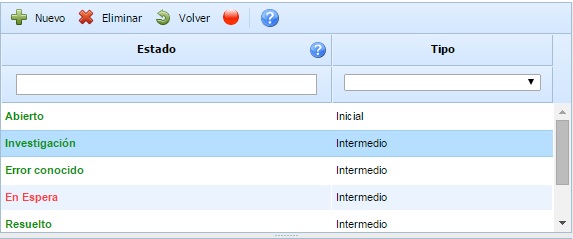 Inicial: Primer estado de un ticket. Esta tipología solo se permite asociar a un único estado de la tabla.